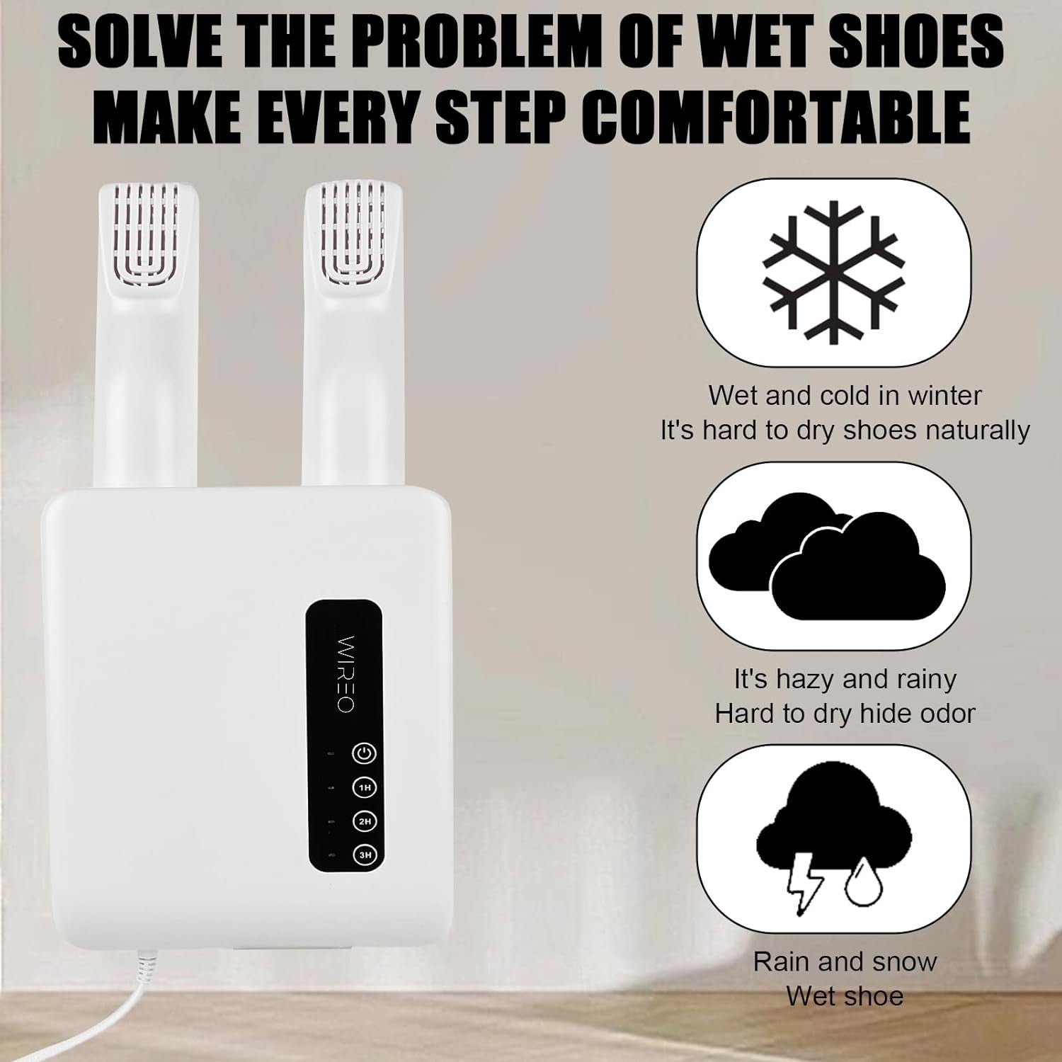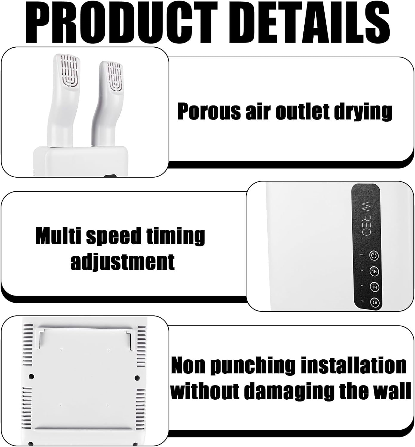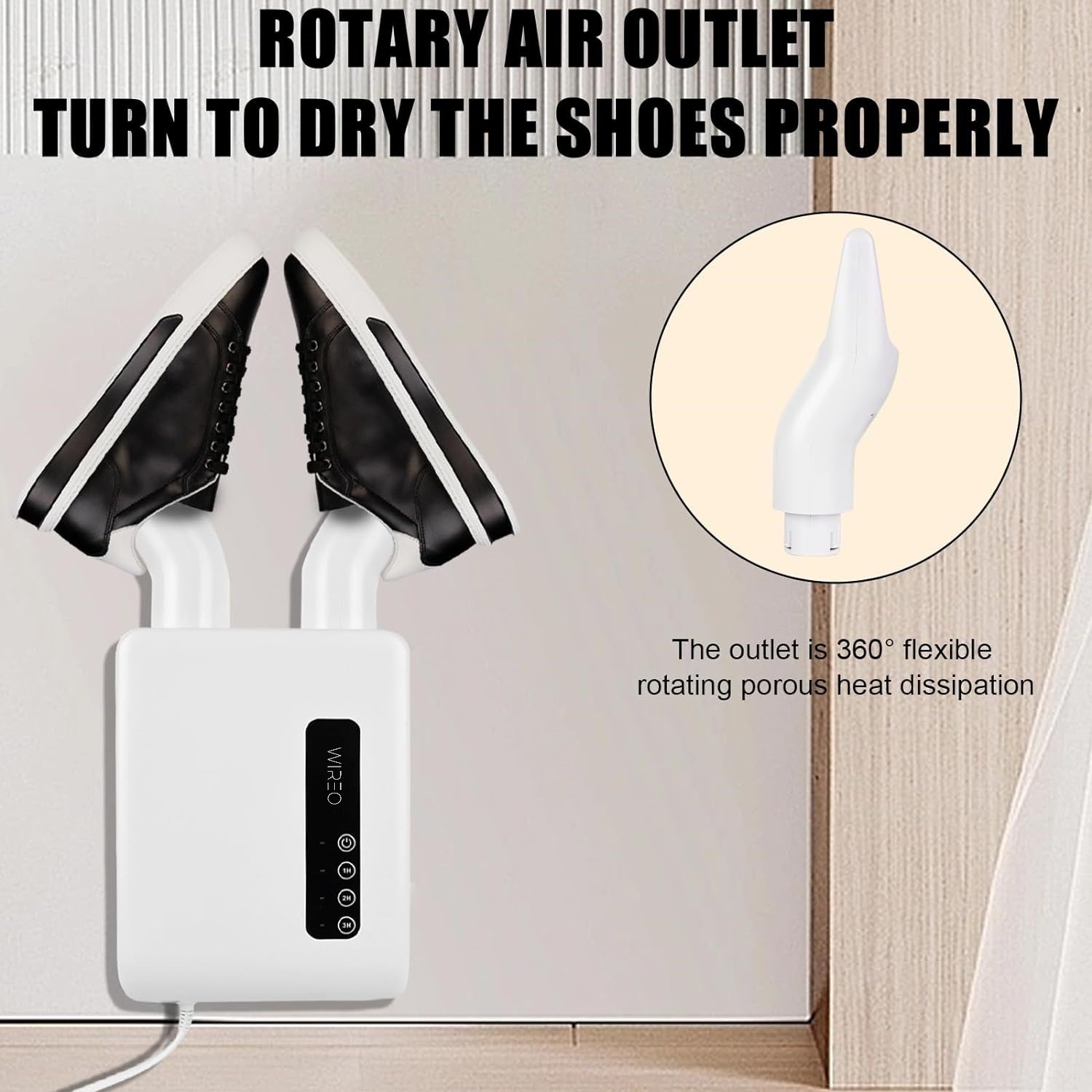 Con 3 modos de secado axustables, un temporizador práctico e acción antibacteriana, elimina a humidade e os malos cheiros de todo tipo de zapatos. Axeitado para colocar no chan ou montar na parede.