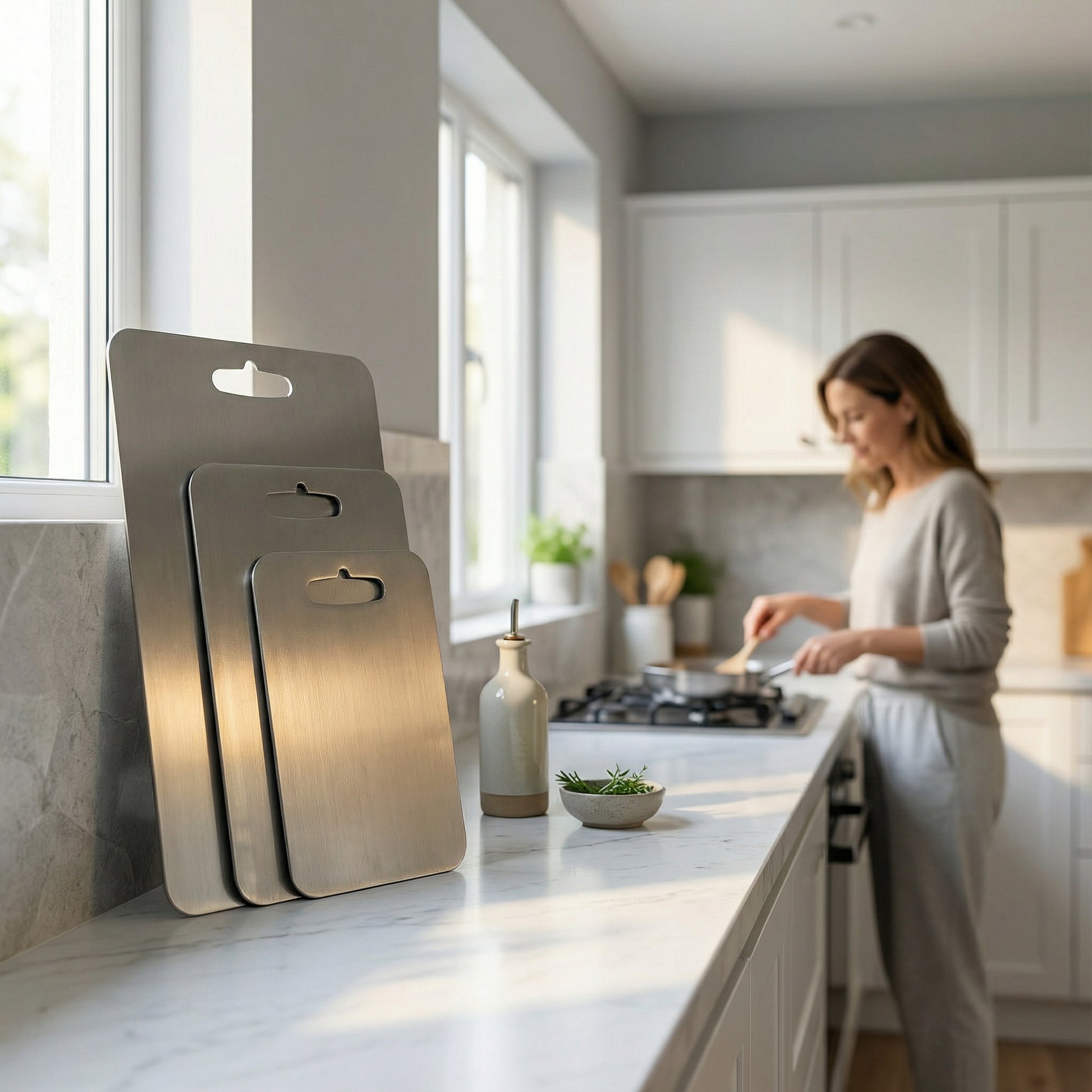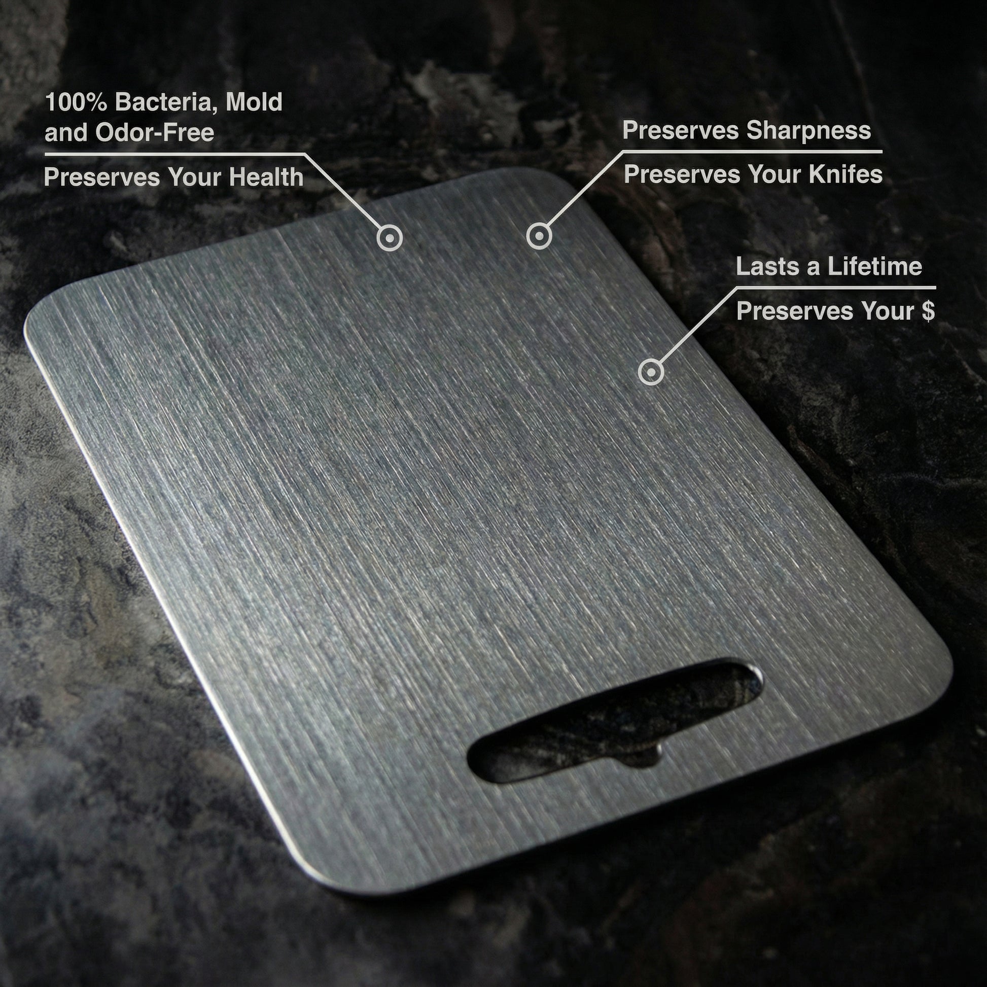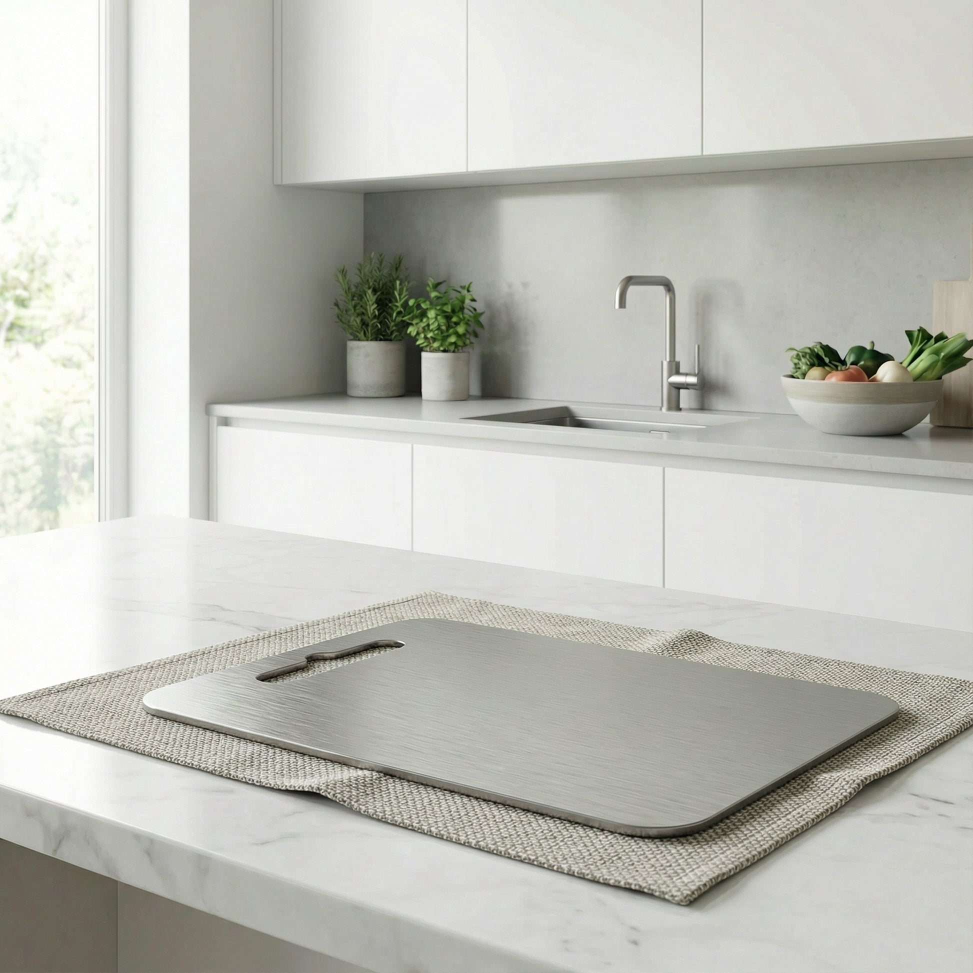 Esta tábua de cortar em titânio foi concebida para quem valoriza uma aparência elegante e uso prático na cozinha. A superfície resistente e o design minimalista tornam esta tábua adequada para tarefas diárias de corte. Uma escolha moderna que combina funcionalidade e estética.